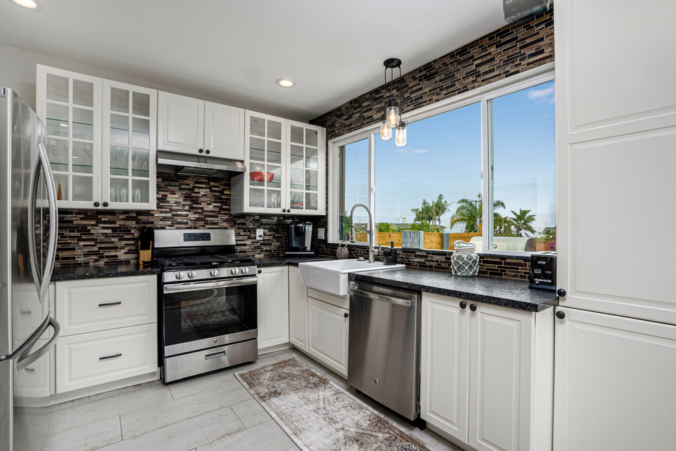 A collection of modern kitchen renovation projects showcasing large marble islands, elegant lighting, dark cabinets, and stainless steel appliances.
